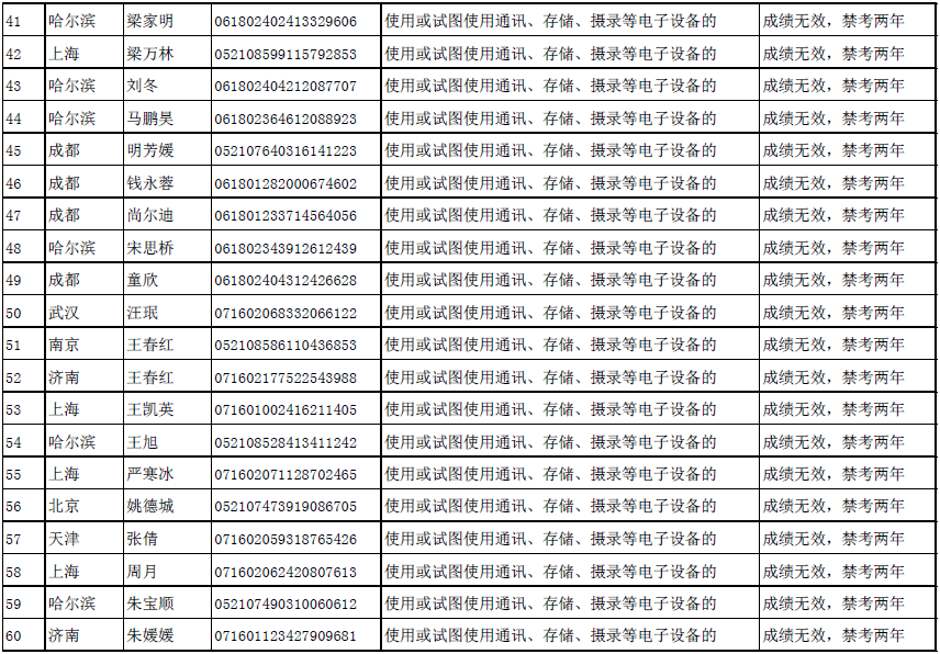 二、对“抄袭或协助他人抄袭与考试内容相关材料的”及“使用或试图使用通讯、存储、摄录等电子设备的”40名违纪人员,给予取消考试成绩并禁考两年的处理;