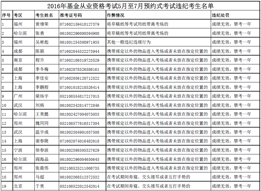 为严肃考试纪律,维护基金从业人员资格考试的公平、公正环境,提高从业人员职业道德操守,营造诚实守信的行业氛围,依据《基金从业资格考试管理办法(试行)》的有关规定,现对2016年基金从业资格考试5月至7月预约考试违纪人员处理结果公告如下: